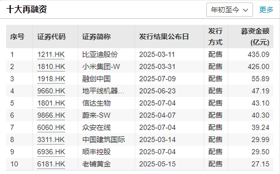 在再融资方面,同样是龙头公司的作用巨大。在前十大再融资项目中,比亚迪股份和小米集团这两大龙头募资金额均超过400亿港元,合计达861亿港元,在2025年以来再融资项目总额中的占比超过五成。