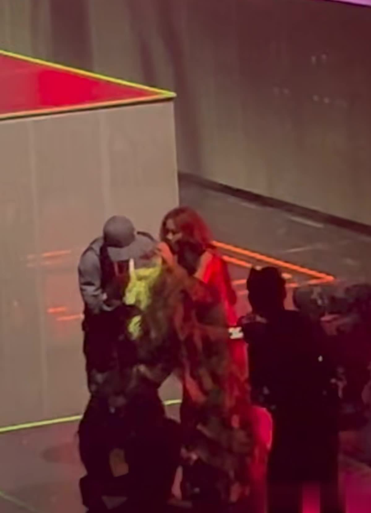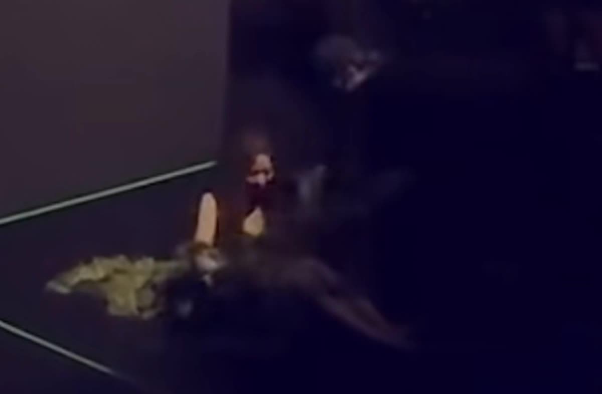 张靓颖跌落升降台之后,坐在地上,她还在朝前来搀扶她的工作人员摆手,好像是在说她没事!