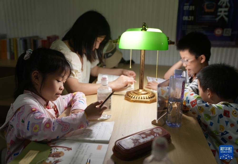 7月1日,一名小朋友(前左)在杭州四牌楼纳凉点的共享书屋内写作业。